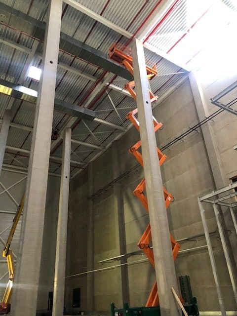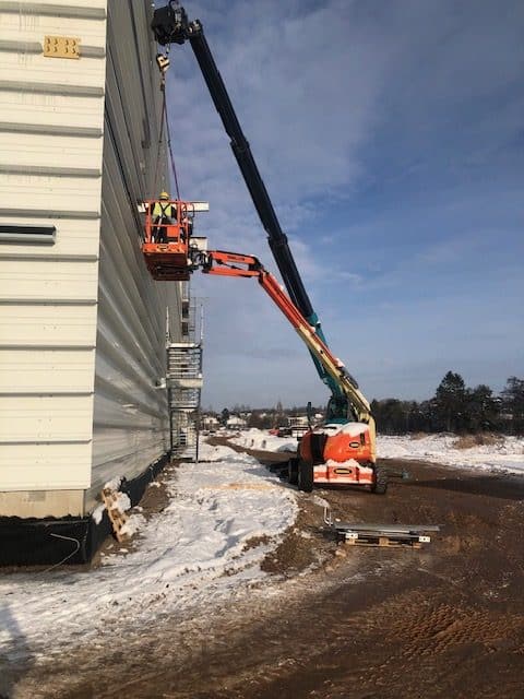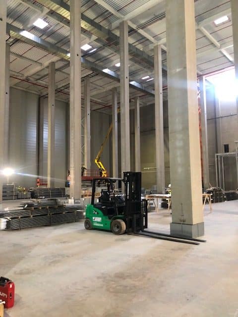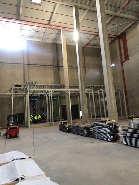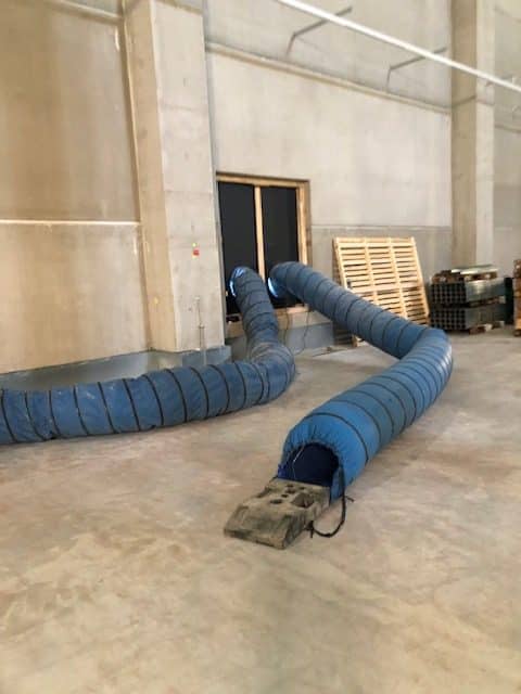 Die Halle wird mittels flexibler Lüftungsrohre beheizt, damit der Innenausbau starten kann.