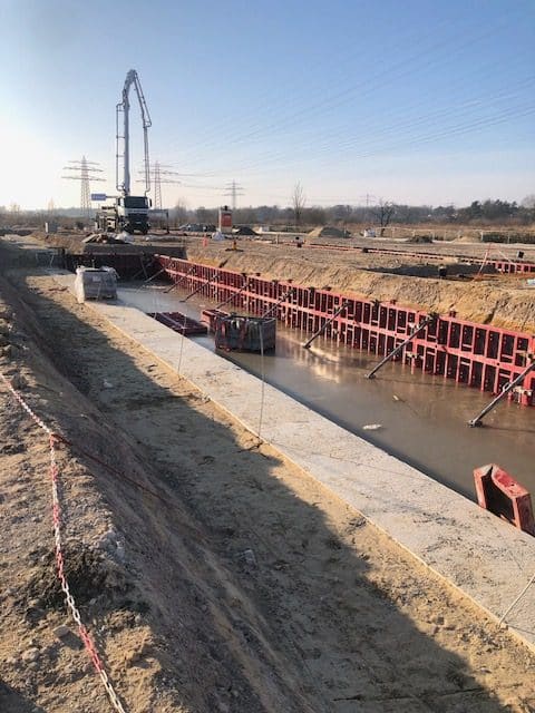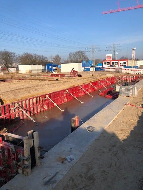 Parallel dazu wurde das Baufeld – wie bei Großprojekten dieser Art üblich – einer Kampfmitteluntersuchung unterzogen. An zwei Stellen ergab sich zunächst der Verdacht auf mögliche Überreste aus dem Zweiten Weltkrieg. Während sich eine Stelle als unbedenklich erwies, musste an einer anderen Position – rund 6,5 Meter tief im Grundwasser – ein verdächtiger Gegenstand in einem aufwendigen Verfahren geborgen werden. Die Analyse bestätigte den Verdacht: Es handelte sich um Überreste einer explodierten Fliegerbombe. Durch das professionelle Vorgehen aller Beteiligten konnten die Arbeiten ohne größere Verzögerungen fortgesetzt werden.
