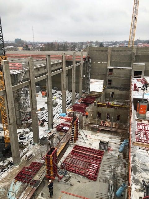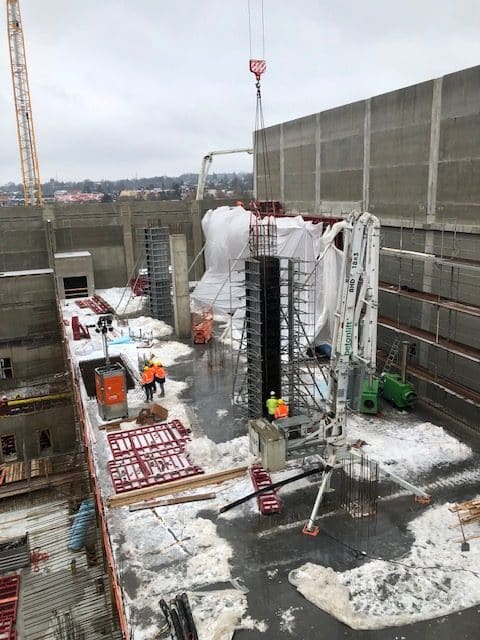 Der Winter hat die Baustelle fest im Griff. Nachdem der erste Schnee weggetaut ist, herrschen eisige Temperaturen. Wo das Fundament für das Parkhaus entstehen soll, befindet sich ein dicker Eisblock.